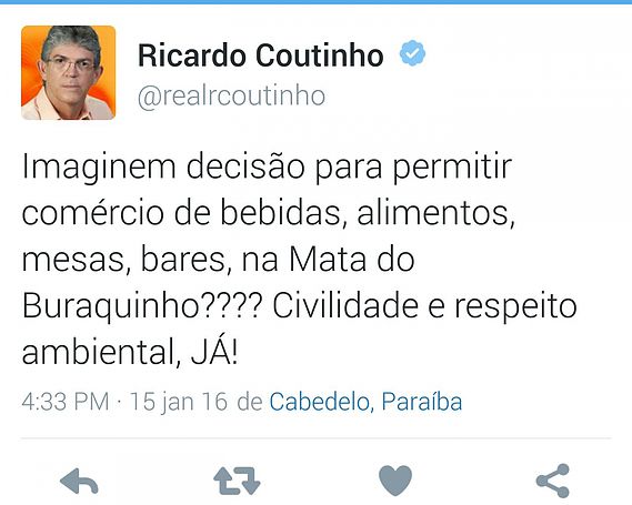 “Imaginem decisão para permitir comércio de bebidas, alimentos, mesas e bares na Mata do Buraquinho? civilidade e repeito ambiental já”, comentou