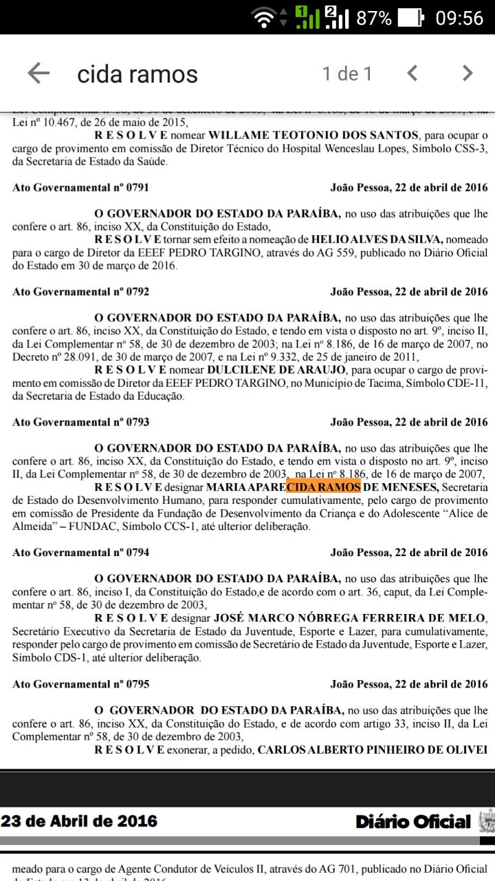 A secretária de Desenvolvimento Humano do Estado, Aparecida Ramos, foi nomeada pelo governador Ricardo Coutinho (PSB) para ocupar cumulativamente a Presidência da Fundação de Desenvolvimento da Criança e do Adolescente (FUNDAC).