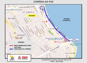 A Superintendência Executiva de Mobilidade Urbana (Semob-JP) vai interditar toda a extensão da Avenida João Maurício, na orla, para a realização da Corrida da Paz, neste domingo (18), a partir das 6h da manhã, com previsão de término e liberação da via para o tráfego de veículos às 9h30. O evento, que acontece em várias cidades do mundo desde 2006, alusivo ao aniversário do Conselho Internacional de Esportes Militar, é realizado aqui em João Pessoa pelo 1º Grupamento de Engenharia do Exército.