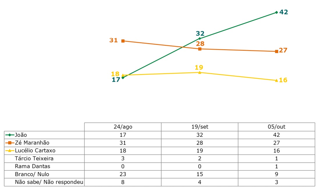A terceira rodada de pesquisas do Ibope Inteligência, na Paraíba, apresenta o candidato do PSB, João Azevêdo, na frente dos adversários. Ele aparece com 42% das intenções de voto na pesquisa estimulada. Considerados apenas os votos válidos, ele vai a 49% e fica muito próximo de se eleger ainda no primeiro turno. Para isso, são necessários 50% dos votos válidos, mais um. O senador José Maranhão aparece em segundo lugar na pesquisa, com 27% dos votos. O parlamentar oscilou negativamente um ponto percentual em relação à última consulta. Já o candidato do PV, Lucélio Cartaxo, oscilou três pontos percentuais para baixo e aparece na atual consulta com 16%.