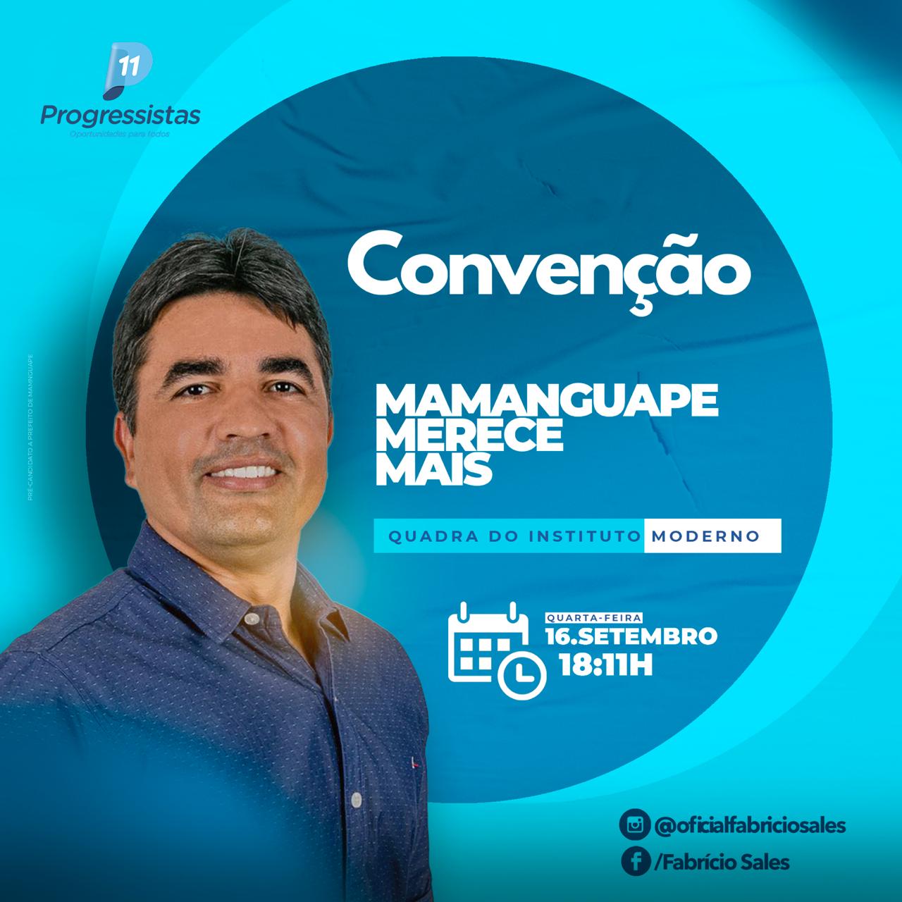 O Progressistas de Mamanguape oficializará durante convenção, nesta quarta-feira, 16, o nome de Fabrício Sales, como candidato do partido nas eleições municipais de 2020 na Rainha do Vale.