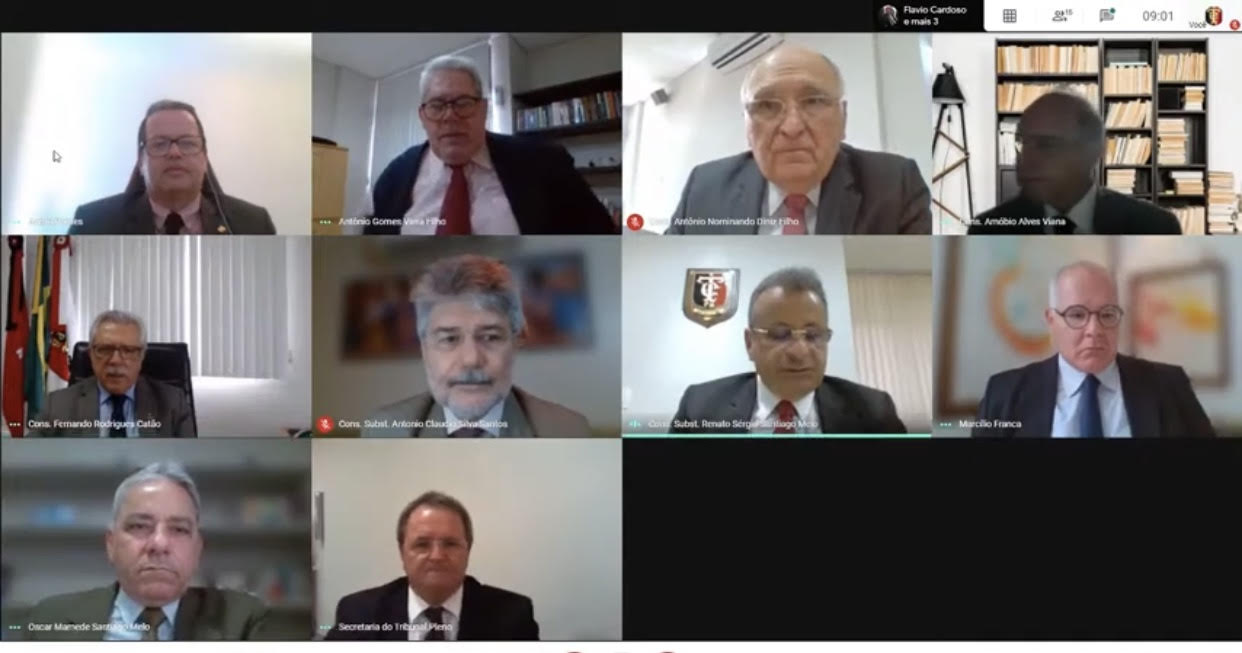 Presidida pelo conselheiro Fernando Catão, o TCE realizou sua 2293ª sessão ordinária remota, por meio de videoconferência, com a participação dos conselheiros Arnóbio Alves Viana, André Carlos Torres Pontes, Nominando Diniz e Antônio Gomes Vieira Filho. Também, os conselheiros substitutos Antônio Cláudio Silva Santos, Oscar Mamede Santiago Melo e Renato Sérgio Santiago Melo. O Ministério Público de Contas foi representado pelo procurador Marcílio Franca Filho.