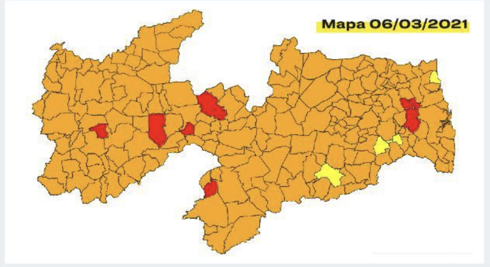 Segundo a avaliação, a Paraíba passou de 138 para 211 municípios em bandeira laranja. A avaliação aponta ainda que 8 deles estão em bandeira vermelha e 4 em bandeira amarela. Segundo o documento, as cidades de Campim, Catingueira, Cuité de Mamanguape, Igaracy, Prata, São José do Bonfim, São Mamede e Sapé são as que apresentam o pior cenário. (Clique aqui e confira).