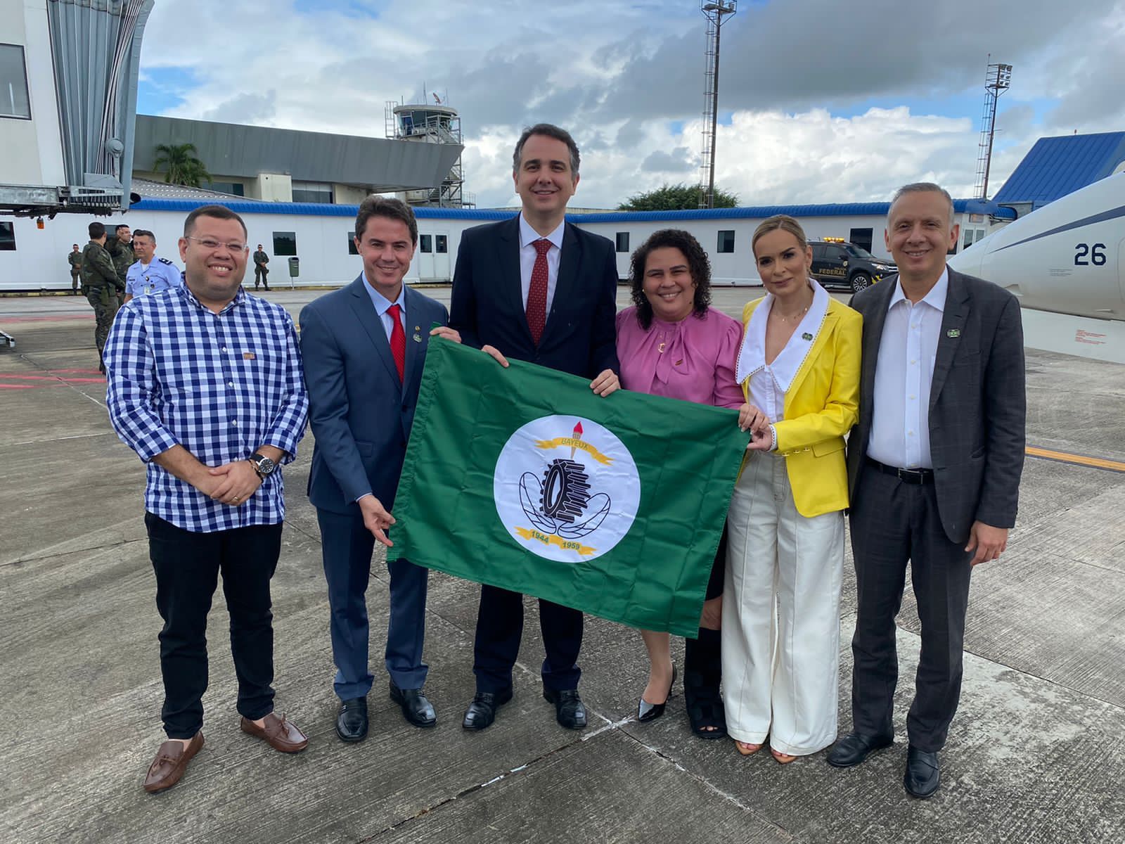 A prefeita de Bayeux, Luciene Gomes, ao lado do seu secretário de Governo e Articulação Política, Leo Micena, recepcionou na manhã de hoje (10) no aeroporto Castro Pinto, o presidente do Senado Federal e atualmente presidente do Brasil em exercício, Rodrigo Pacheco.