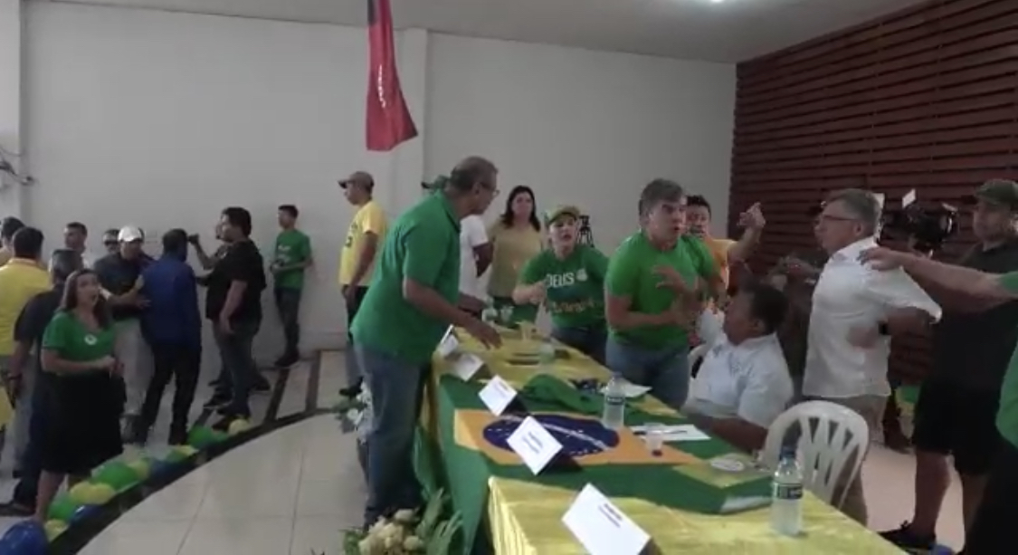 É possível ver neste momento, o policial Caio (PL), candidato a deputado federal, tentar sacar uma arma contra Gilberto.