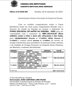 Com as emendas destinadas por Edna Henrique, milhares de caririzeiros serão beneficiados com os serviços, que eram reivindicações antigas de todas as cidades da região e que agora, terão acesso a tratamento dentro dos princípios do Sistema Único de Saúde. Trinta municípios paraibanos serão beneficiados.