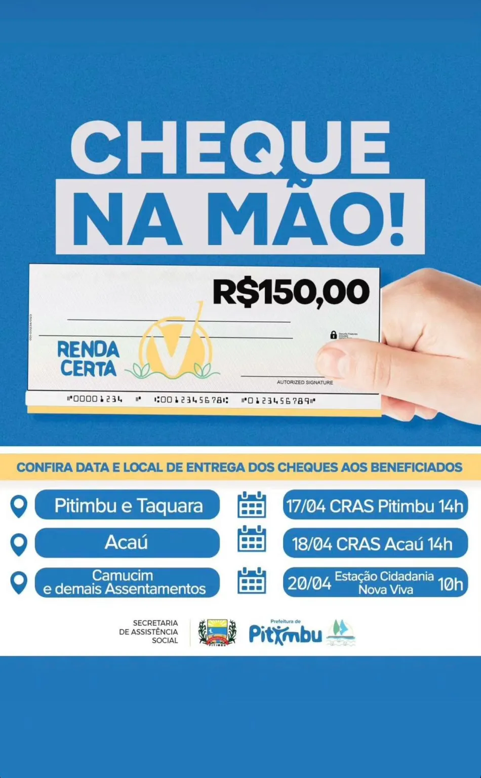 Centenas de famílias pitimbuenses vão poder contar com um reforço em sua renda a partir desta segunda-feira (17), através do Programa Municipal de transferência de recursos denominado “RENDA CERTA”.