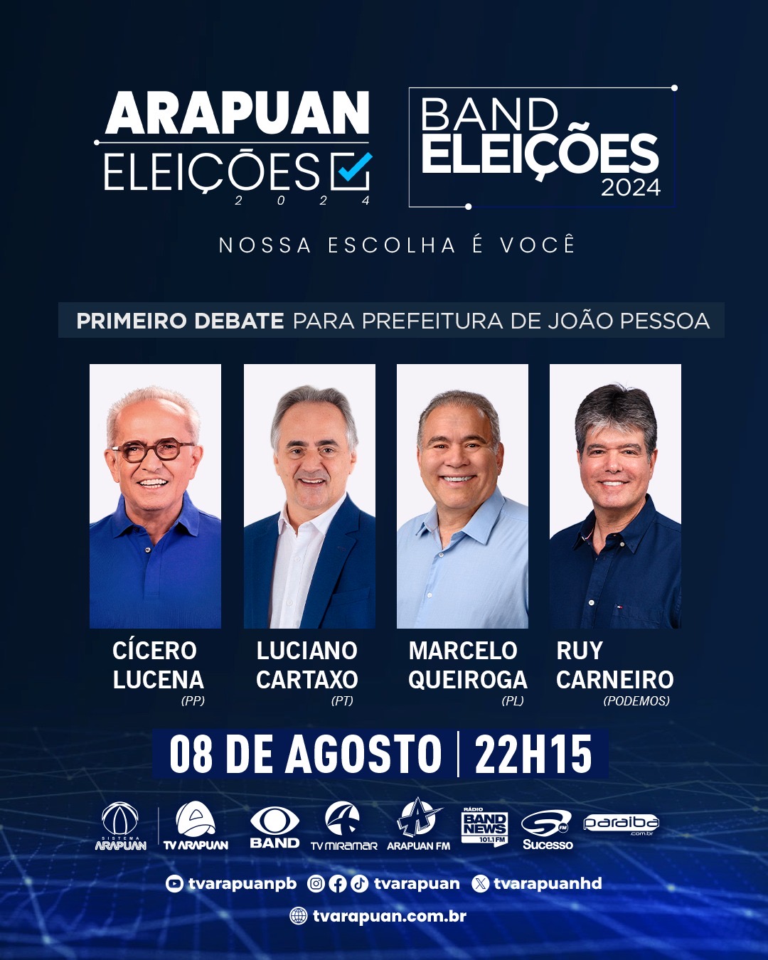 Estarão frente a frente Cícero Lucena (PP), Luciano Cartaxo (PT), Marcelo Queiroga (PL), e Ruy Carneiro (Podemos) apresentando suas propostas de governo e debatendo soluções para os desafios da cidade. A mediação ficará a cargo do experiente jornalista Luis Torres.