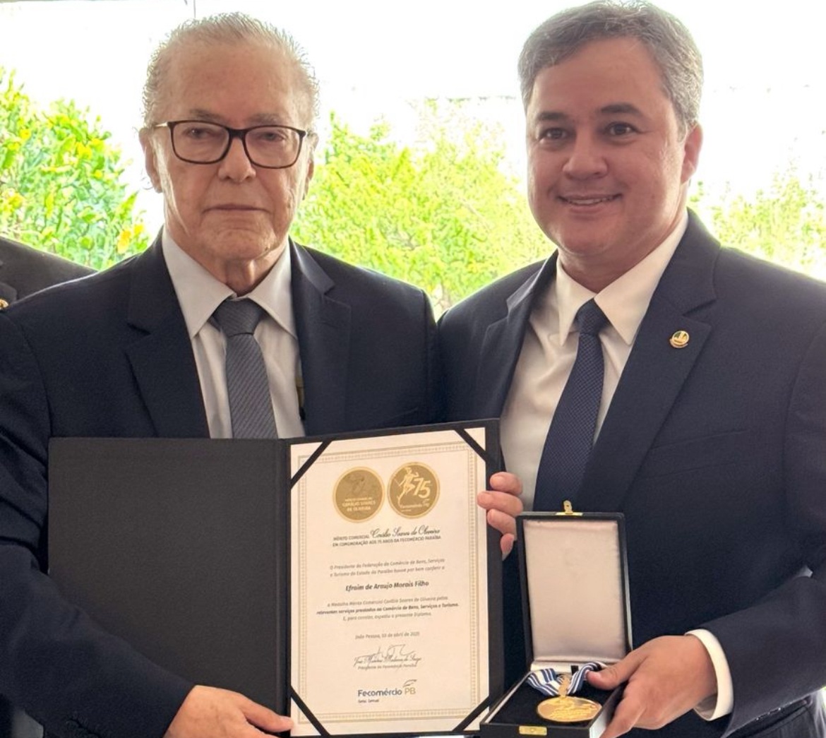 Em um almoço festivo realizado no restaurante oficial do Sesc na Câmara dos Deputados, nesta quarta-feira (09), o Sistema Fecomércio-PB prestou homenagem ao senador Efraim Filho (União Brasil-PB) com a entrega da Medalha Mérito Comercial Corálio Oliveira. A comenda reconhece os relevantes serviços prestados pelo parlamentar ao comércio paraibano e foi entregue pelas mãos do presidente da Fecomércio PB, Marconi Medeiros. A condecoração também foi concedida ao presidente da Câmara dos Deputados, Hugo Motta (RP-PB) e ao governador João Azevedo (PSB-PB).